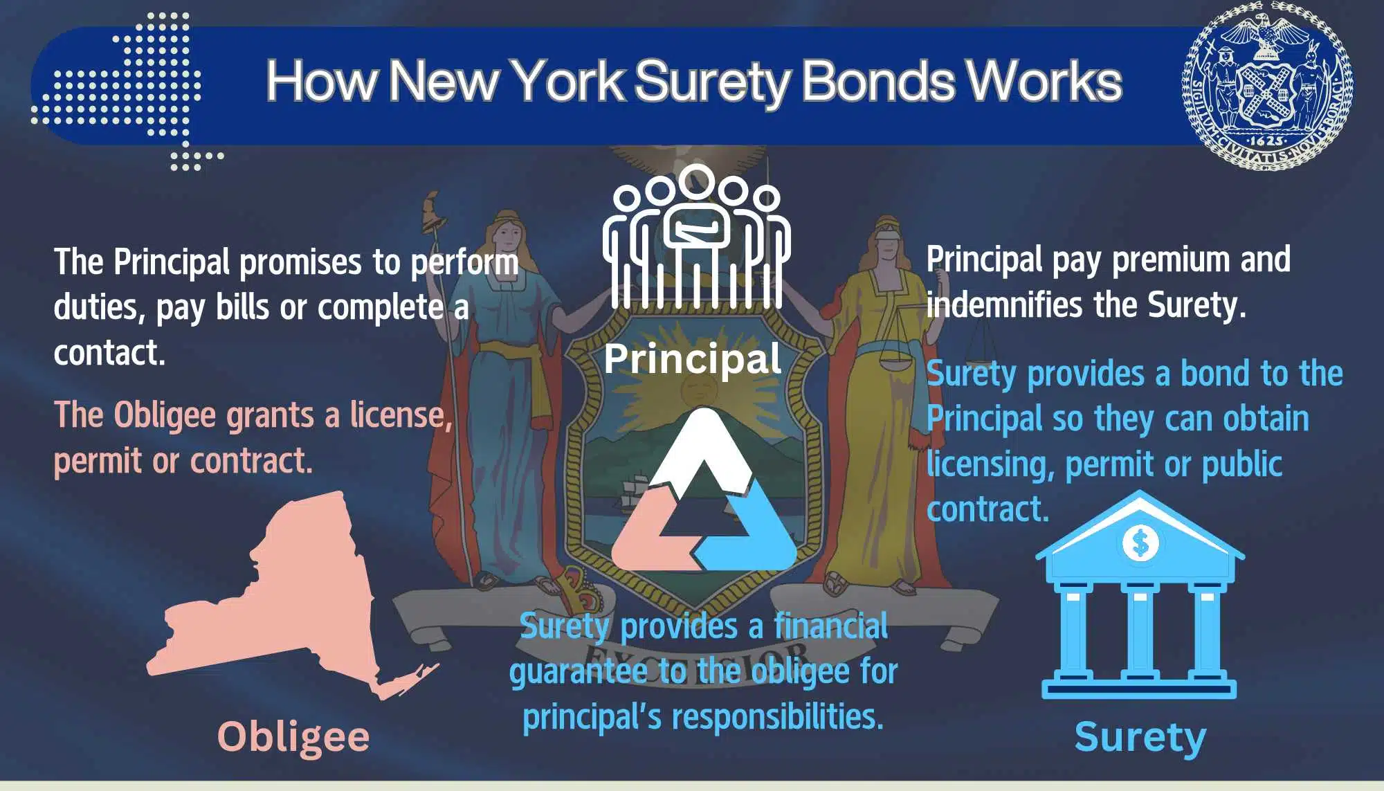A New York Surety Bond is a three-party agreement between a principal, an obligee and a surety bond company. The principal is the party who is responsible for the bond obligation. This is typically a New York individual or company who needs a license, permit, or other guarantee running to the state. The party receiving the benefit of the bond is the Obligee. For many New York bonds, this is the state of New York or one of their departments. The Surety is a third-party bond company that is providing a financial guarantee of the principal's obligation on the bond. Should the principal default on their obligation, a party can make a claim against the bond.
