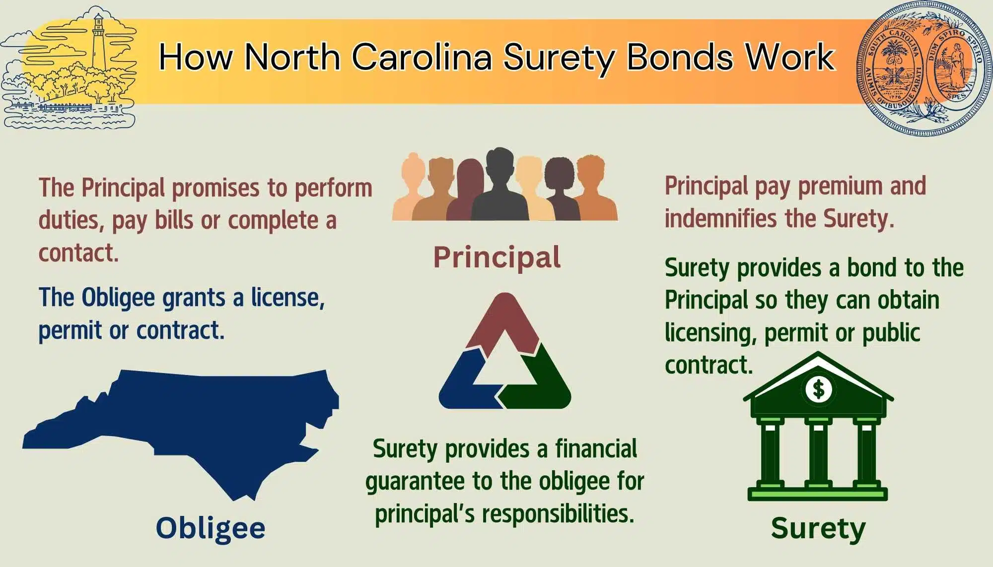 A North Carolina Surety Bond is a three-party agreement between a principal, an obligee and a surety bond company. The principal is the party who is responsible for the bond obligation. This is typically a North Carolina individual or company who needs a license, permit, or other guarantee running to the state. The party receiving the benefit of the bond is the Obligee. For many North Carolina surety bonds, this is the state of North Carolina or one of their departments. The Surety is a third-party bond company that is providing a financial guarantee of the principal's obligation on the bond. Should the principal default on their obligation, a party can make a claim against the bond.